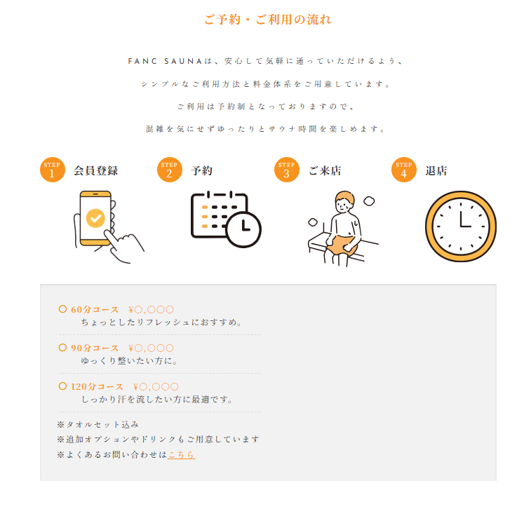 よくある質問や施設ルールなど、多くのサウナで必須となる情報整理もしやすい構造にしました。